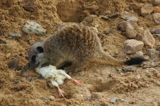 Jersey Zoo: een Meerkat die net eten heeft gekregen